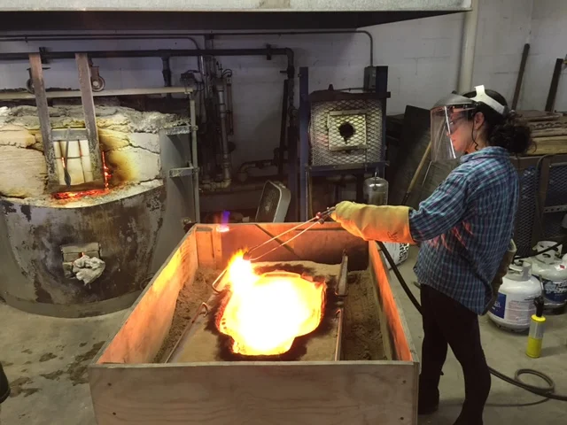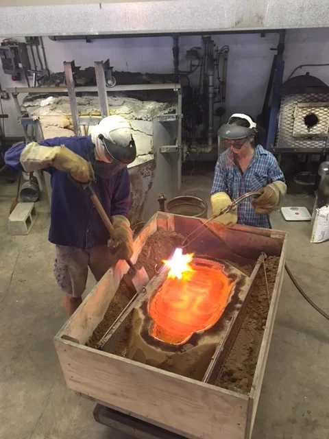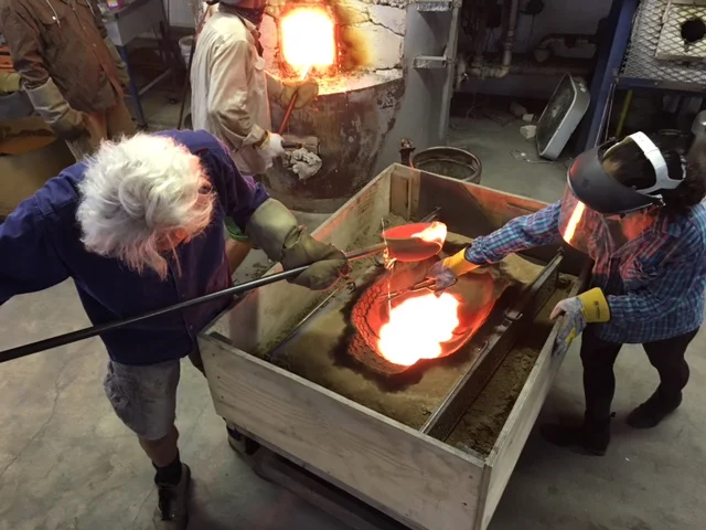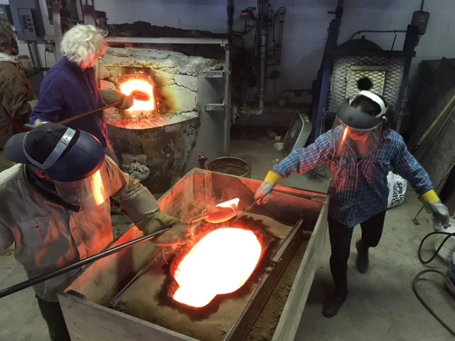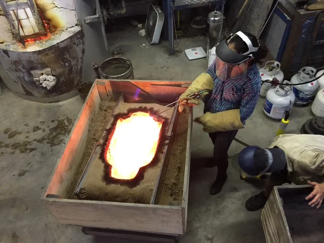 Ladle casting is done by filling the sand mold, one ladle of molten glass at a time. With a mold this size, this is a long (and sweaty) process.