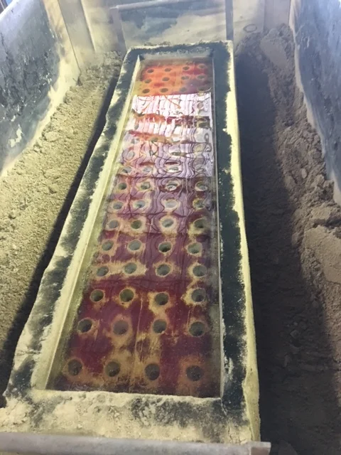 This half of the body has been slowly cooled down to 900 degrees. At this temperature, the glass is now solid enough to move into the annealing (cooling) oven which will bring the panel to room temperature over a week's time.